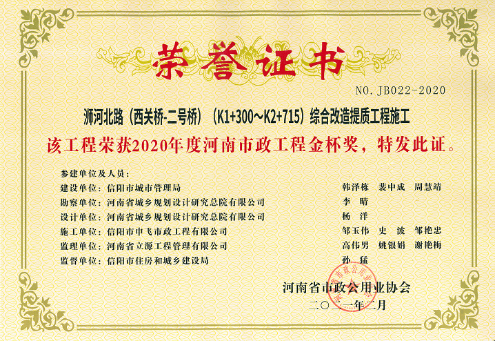 其中,公司承建的浉河北路改造提質(zhì)等重點(diǎn)工程獲得省“金杯獎(jiǎng)”、“省優(yōu)良工程”、“省安全文明工地”等榮譽(yù)。